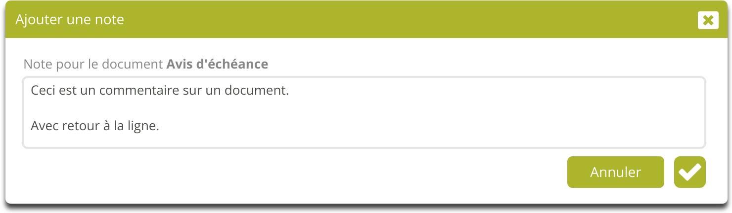 Dans le menu à droite du document, vous trouverez une option pour ajouter une note ou éditer la note existante. Vous pouvez aussi cliquer sur sur l’icône de note pour l'éditer. Une fenêtre propose de saisir la note :